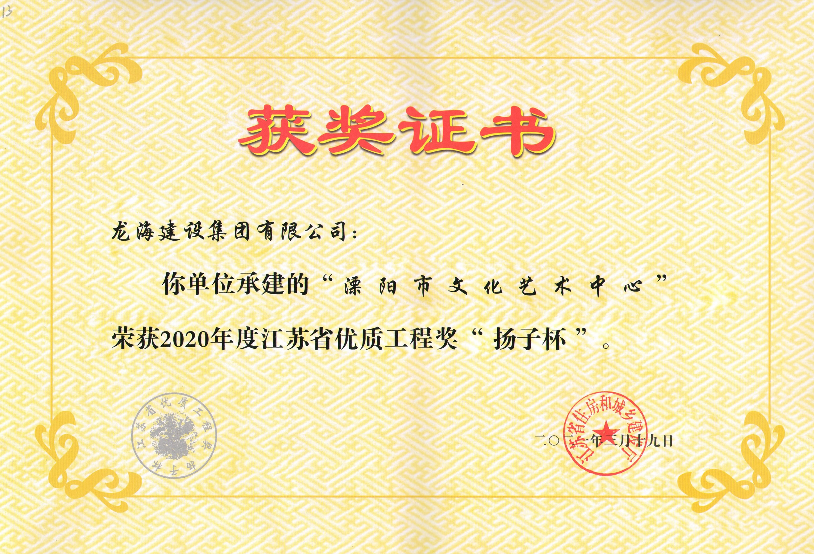 近日,我司承建的“溧阳市文化艺术中心”喜获2020年度江苏省优质工程奖“扬子杯”。该奖为江苏省建筑工程质量最高荣誉奖,由江苏省住房和城乡建设厅组织,江苏省建筑行业协会等单位参与评选。
